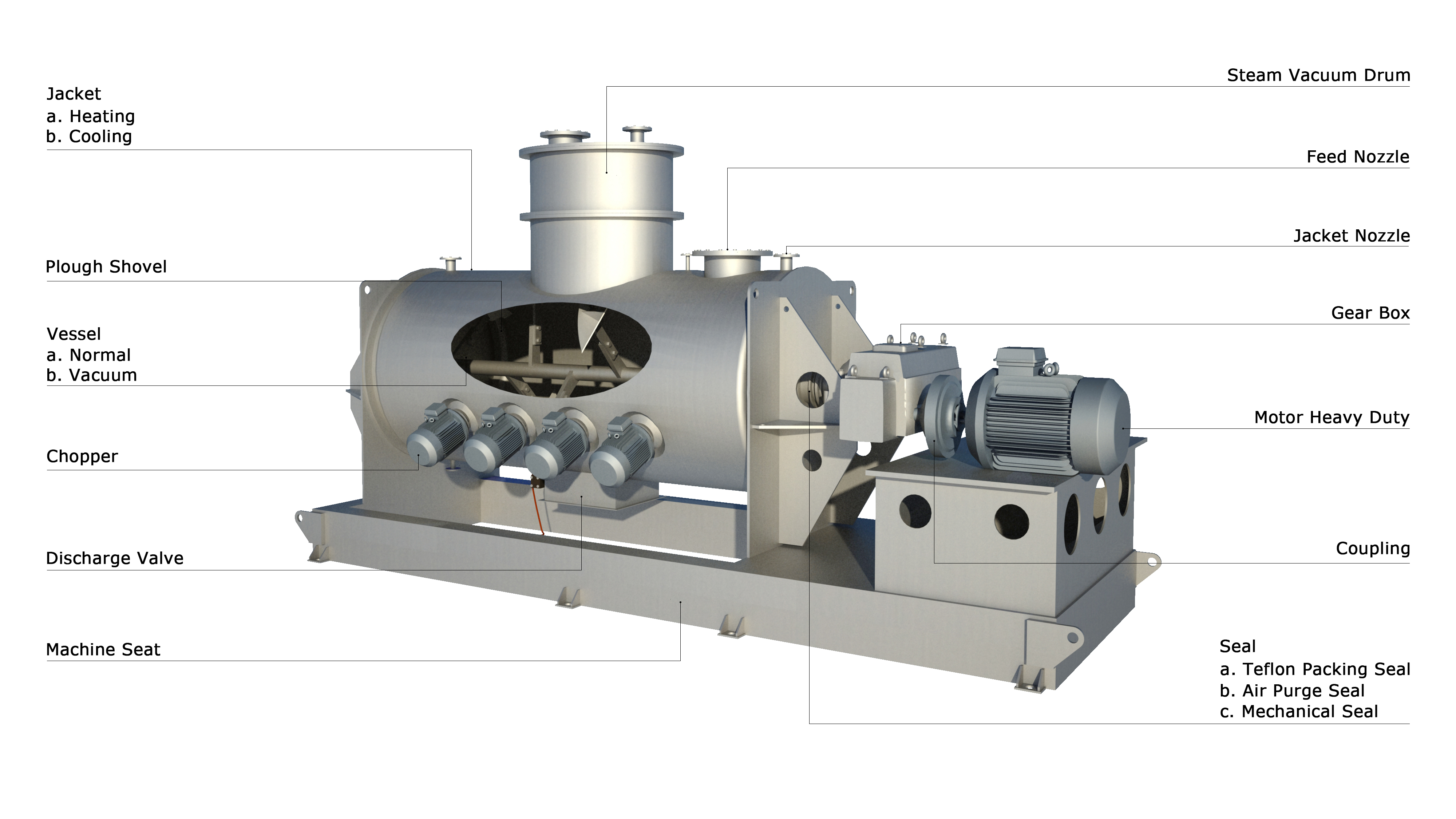 Plough Shear mixer consists of a cylindrical drum containing plough shaped mixing elements that are mounted on a horizontal shaft. It creates a mechanical fluidized bed mixing action. The mixing tools project and hurl material away from the wall into free space in a crisscross direction, and inversely back again. The plow separates and lifts the product into three-dimensional motion, while the number and arrangement of the tools insure agitation back and forth along the length of the vessel. When required, the mix action is assisted by high speed chopper devices–independent high-speed motors with customized blades for adding shear to the product mix.